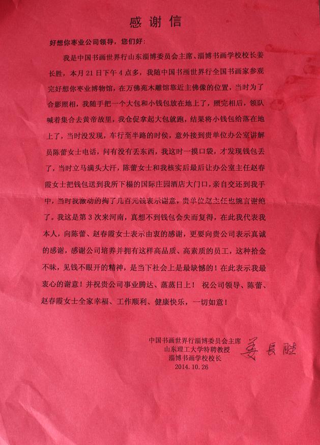 日前,一封署名为“中国书画世界行淄博委员会主席、淄博书画学校校长姜长胜”的感谢信寄到了好想你枣业股份公司。信中,姜先生对好想你枣业办公室副主任赵春霞及员工陈蕾拾金不昧的行为进行感谢。