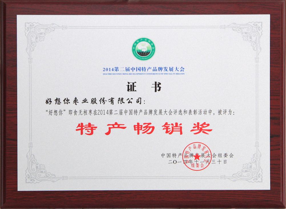 由中国特产采购协会、中国药文化研究会、中国营销协会、中国农业科学院农业传媒与传播研究中心、中国县域经济报社联合主办的“2014第二届中国特产品牌发展大会”于2014年11月30日在北京民族饭店召开,知名产业专家、相关部委领导、电子商务领导、金融资本领导、特产企业领导和媒体代表约300余人参加。本次大会以“创新营销思路、分享品牌智慧”为主题,好想你即食无核枣获特产畅销奖。
