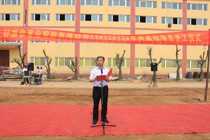 奠基仪式上,石聚彬董事长发表了重要讲话。他指出,随着公司的上市和生产规模的不断扩大,生产车间和现代化管理设施也必将得到相应的提升。此次车间建设,是公司上市后的募投项目之一,也是公司扩大红枣加工规模,提高产品市场占有率,进一步加大红枣加工技术的科研力度,促进高新技术人才引进,增强企业竞争力的需要。