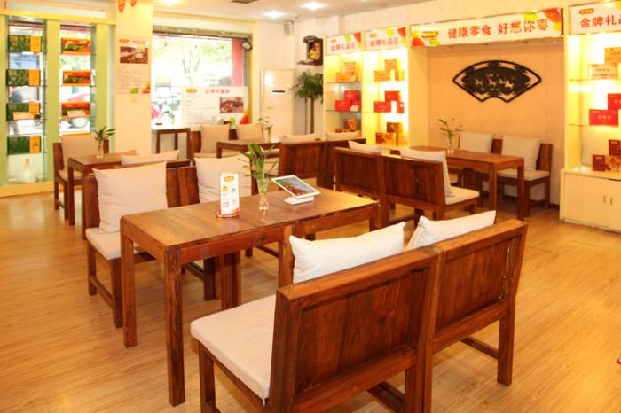 好想你郑州农业路店店长赵媛见顾客挑选完商品,就把他们引到休闲区休息。休闲区摆放着四张桌子,八把木椅,椅子上摆着很讲究的坐垫和靠枕,椅背上篆刻着好想你的LOGO。赵媛说,这个区域原本是店里收银台的位置,店面升级后,就改造为顾客休闲区。跟收银台同样命运的还有原先摆在店中央的货架,压缩后留给顾客更多选购、休闲的空间。