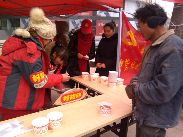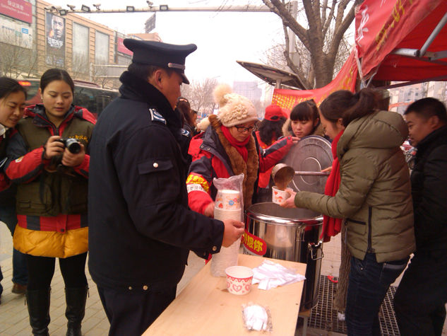 在绿城广场附近,一位外国友人也喝到了好想你的爱心粥,不住地发出声声赞叹,还用不太标准的普通话说道:“谢谢你们!”“好想你有名啊,好想你的枣甜啊……”一位正在喝粥的大爷向排队取粥的老友说。“多给我舀几颗枣,我就是冲着好想你的枣来的……”一位穿着时尚的大妈对盛粥的工作人员说,说完一群人禁不住哈哈大笑起来。